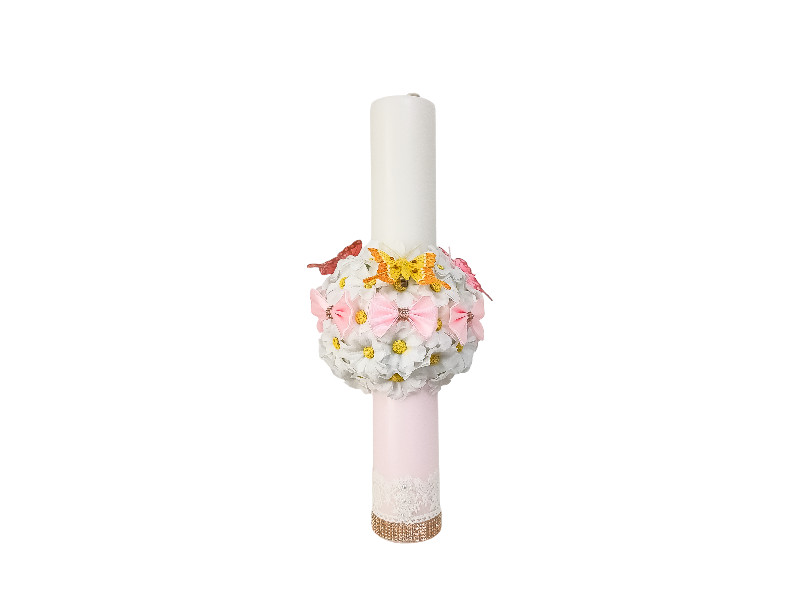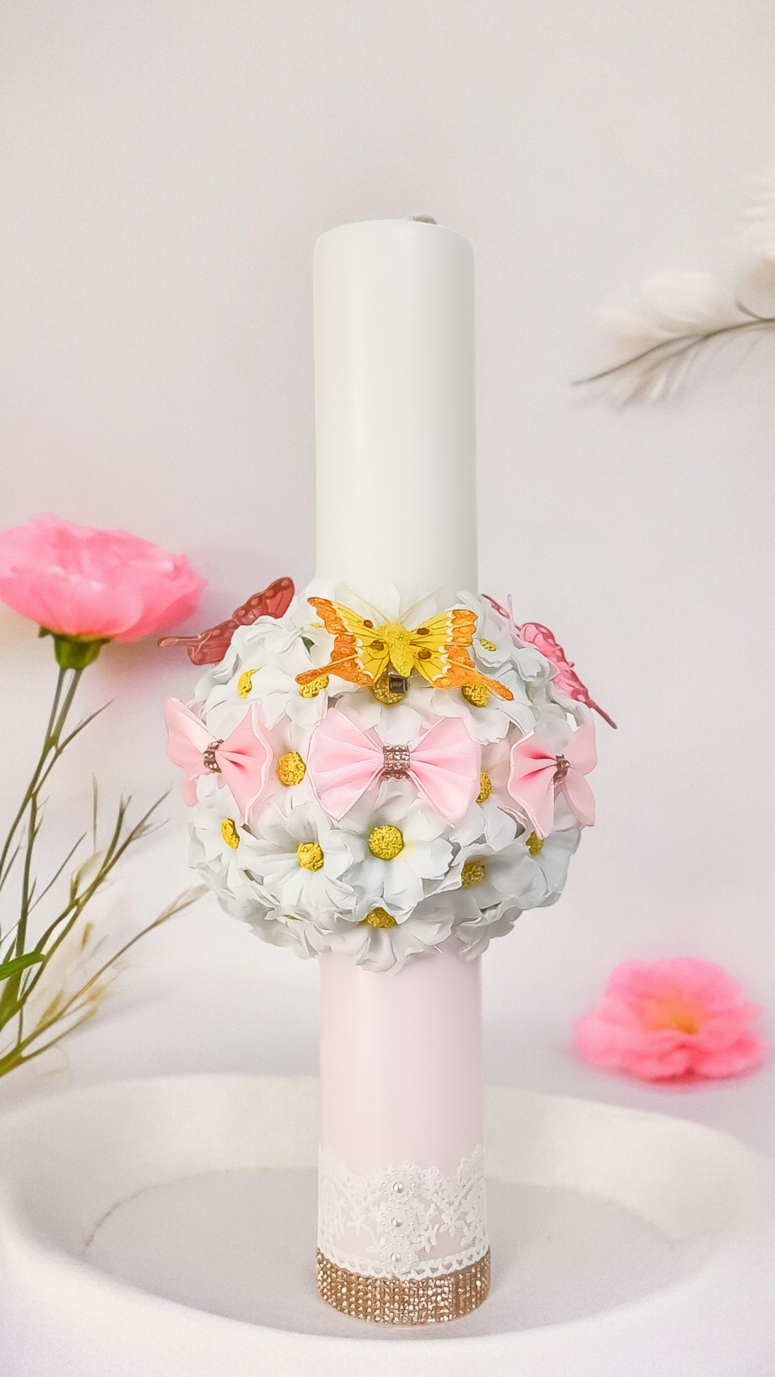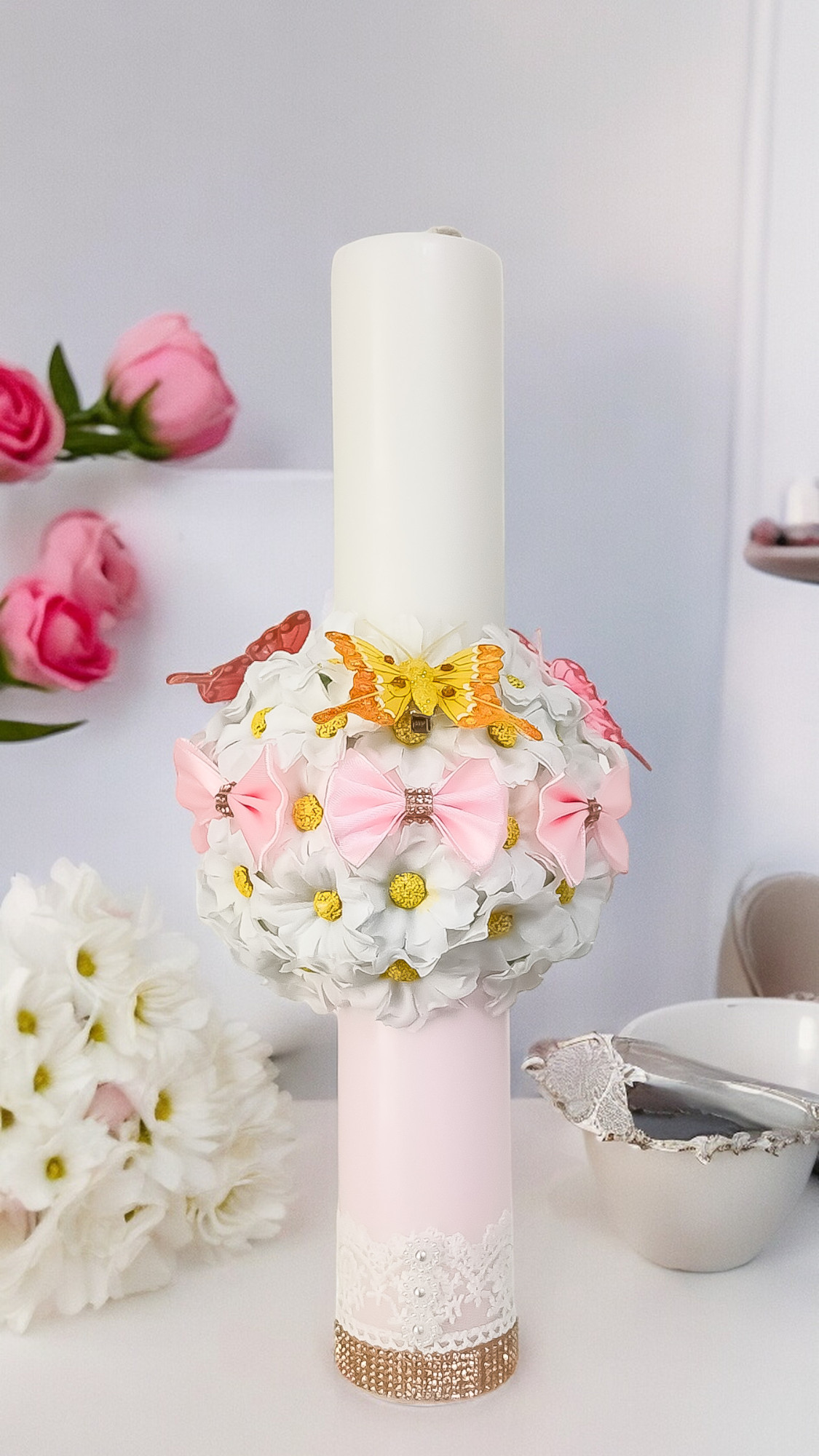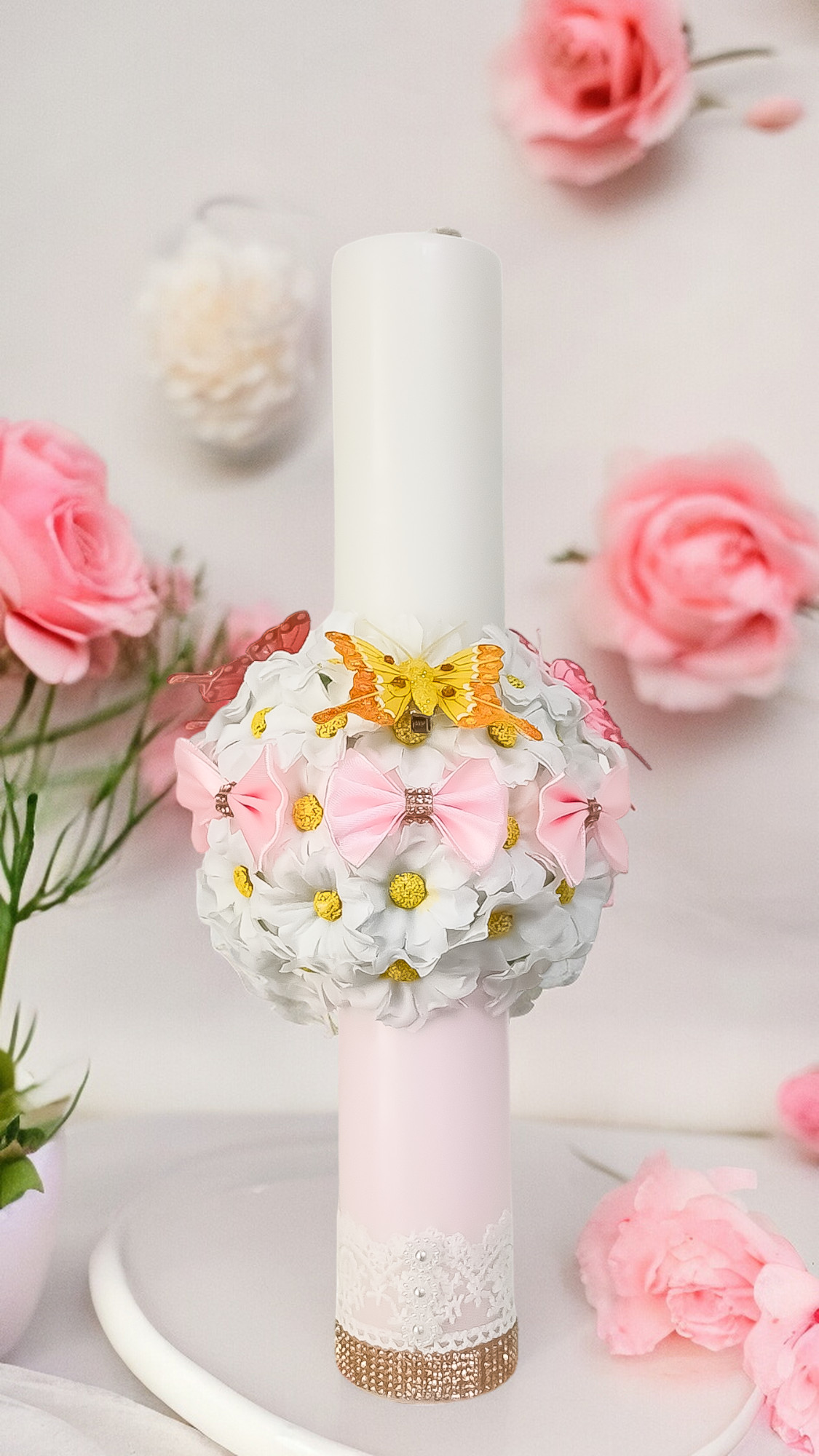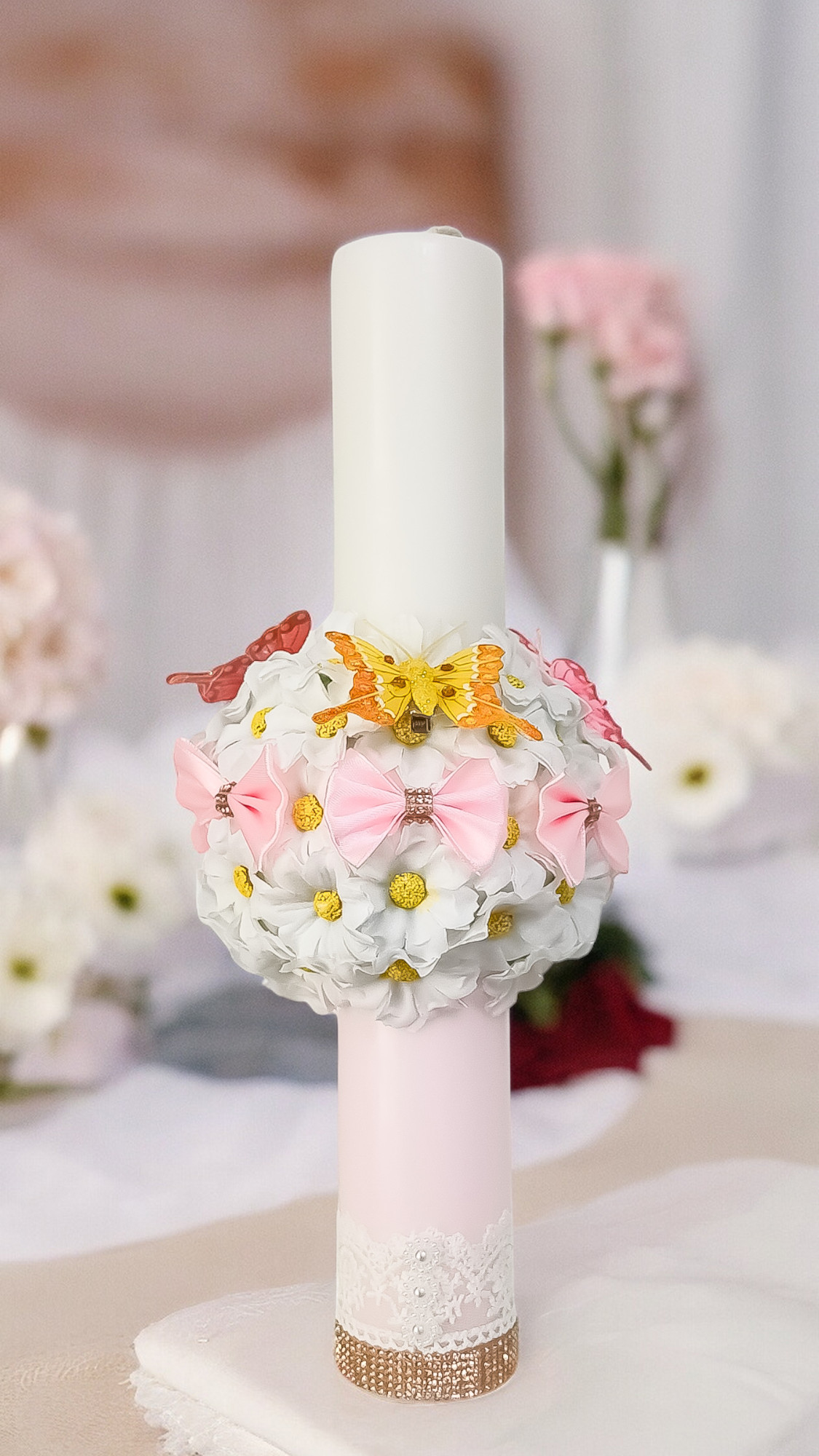 Lumânare de Botez Handmade – Design Alb și Roz cu Aranjament Floral și Fluturi