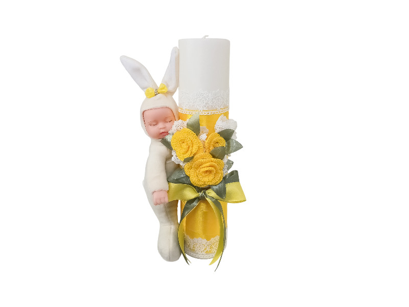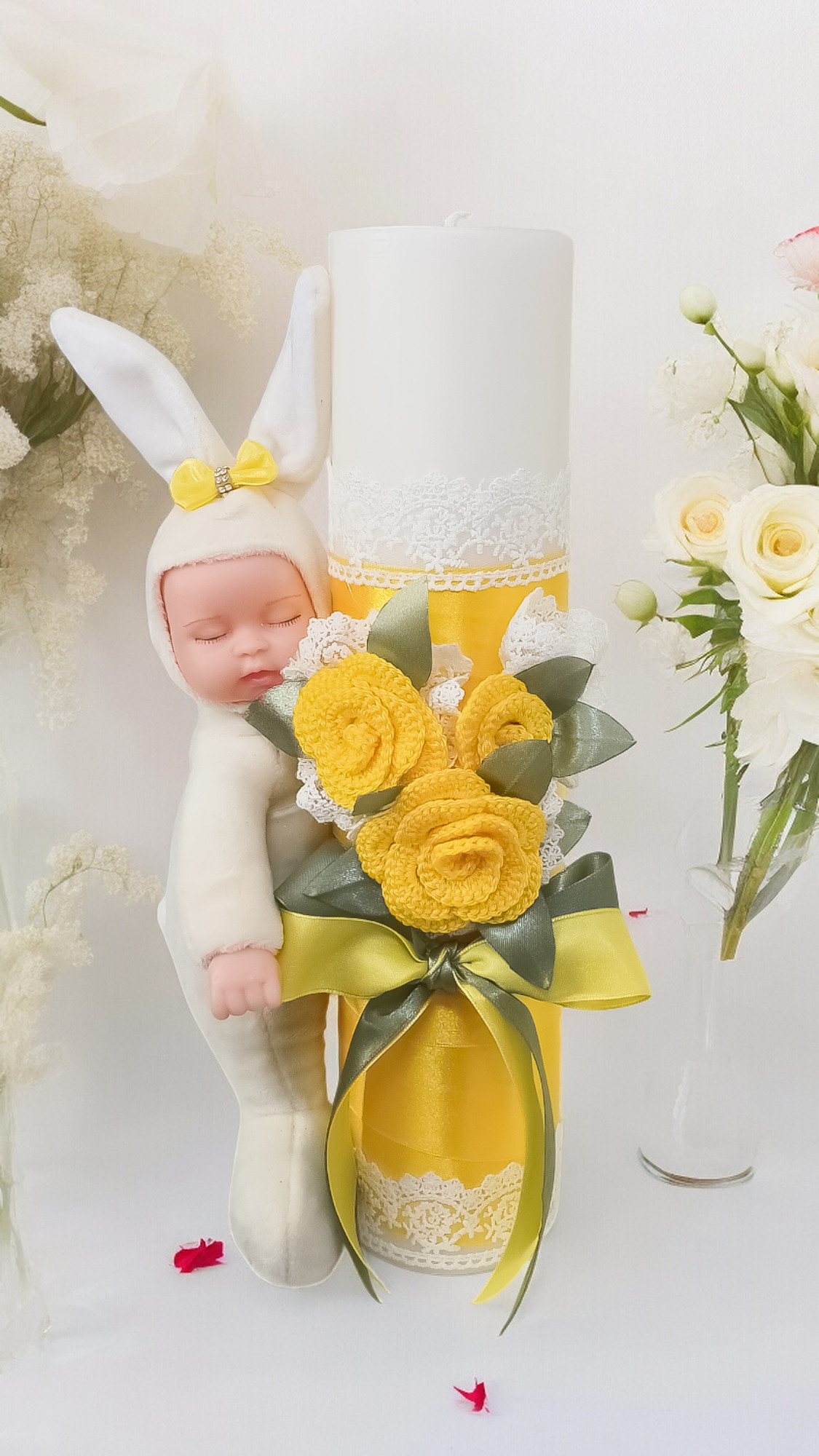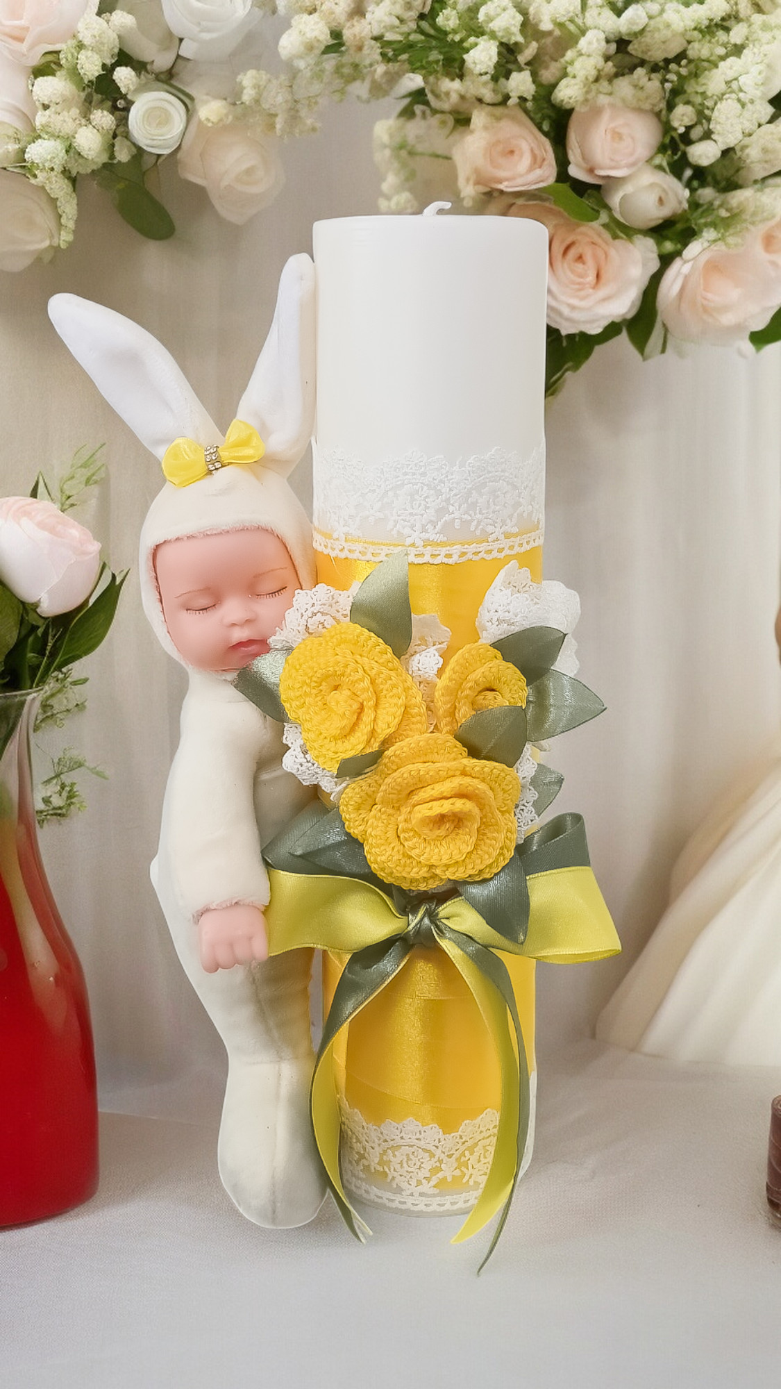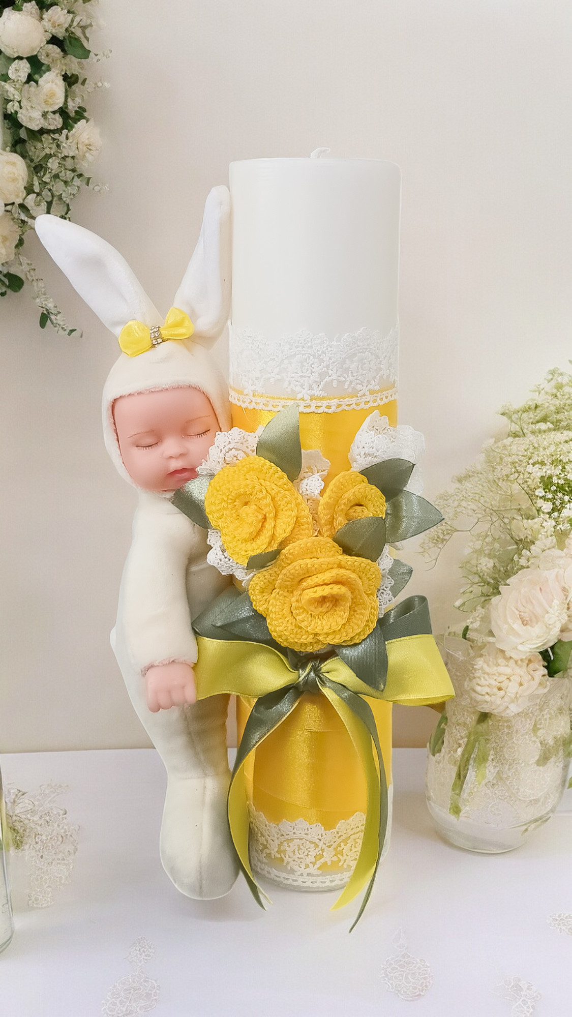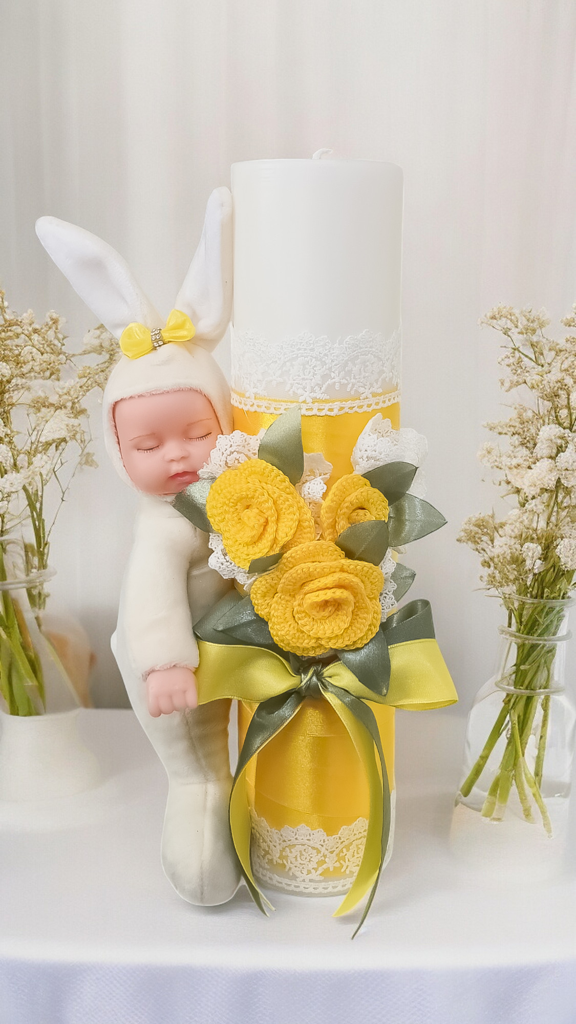 Lumanare botez, H 31 cm si D 7 cm, FABRICA DE LUMANARI GHIOROC, cu satin galben, somnoros, flori galbene crosetate, dantela cu satin, fontita lime cu maslinu