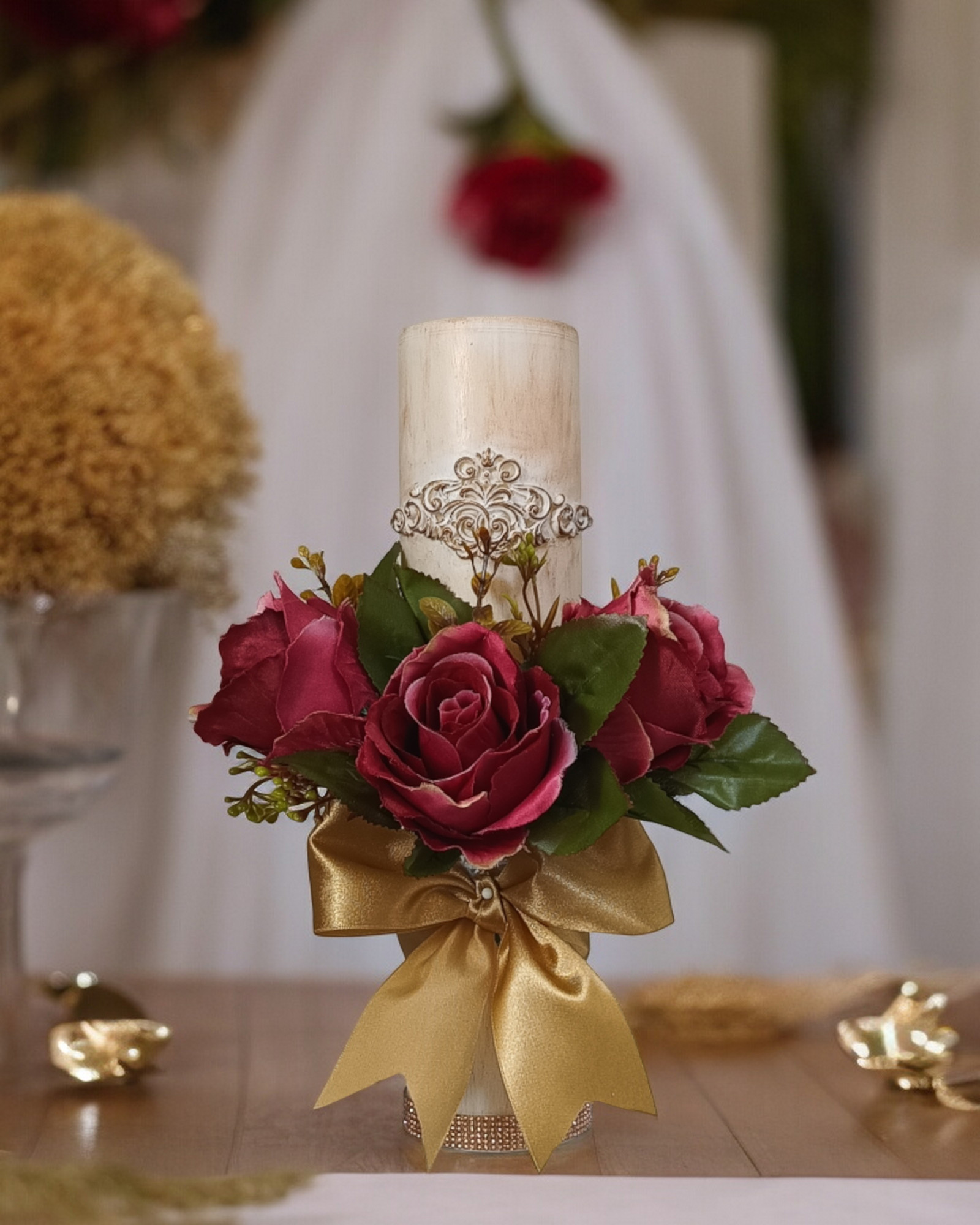 - Trandafirii bordo aduc profunzime și maturitate vizuală, contrastând frumos cu strălucirea aurie, pentru a inspira un sentiment de continuitate și promisiune.