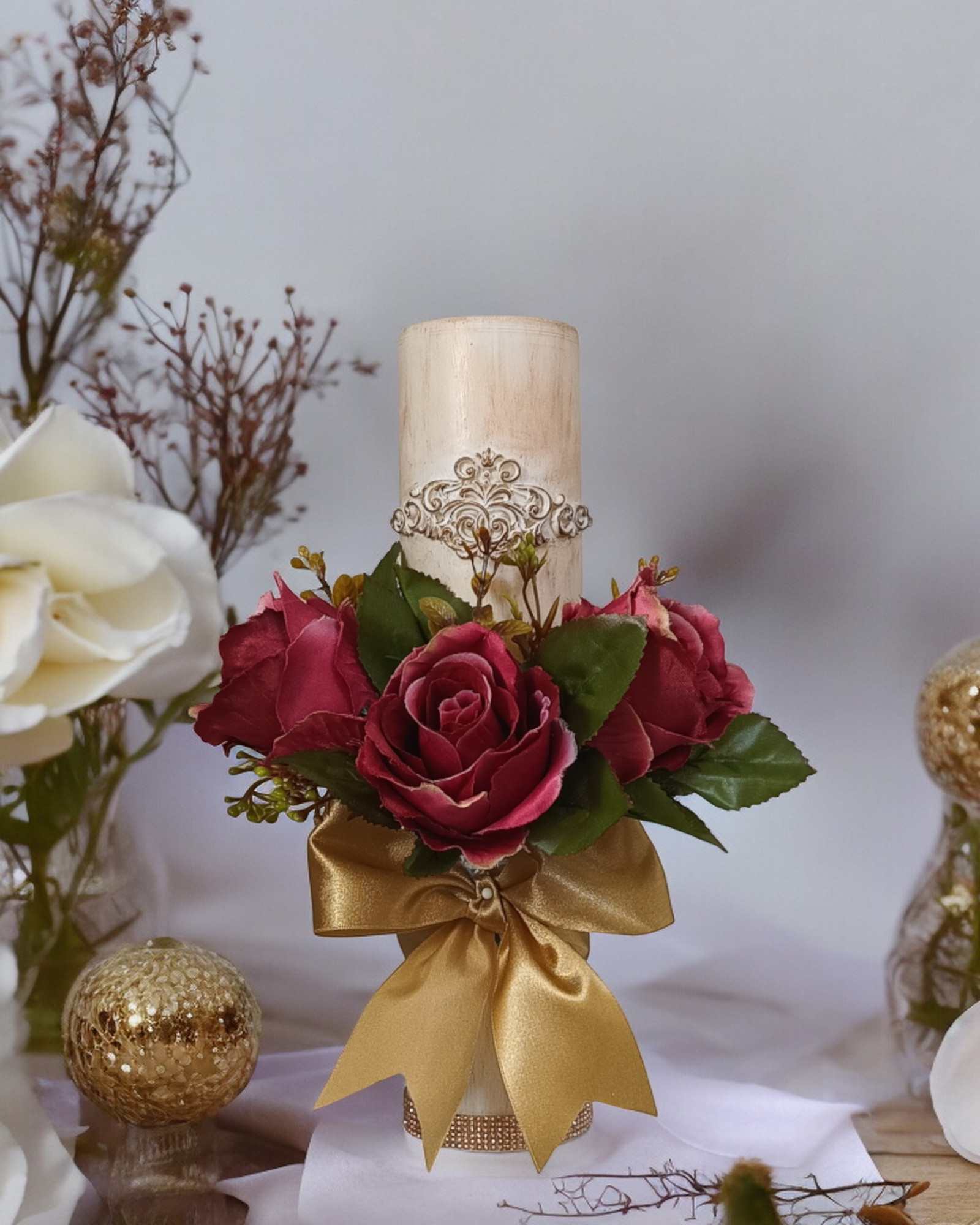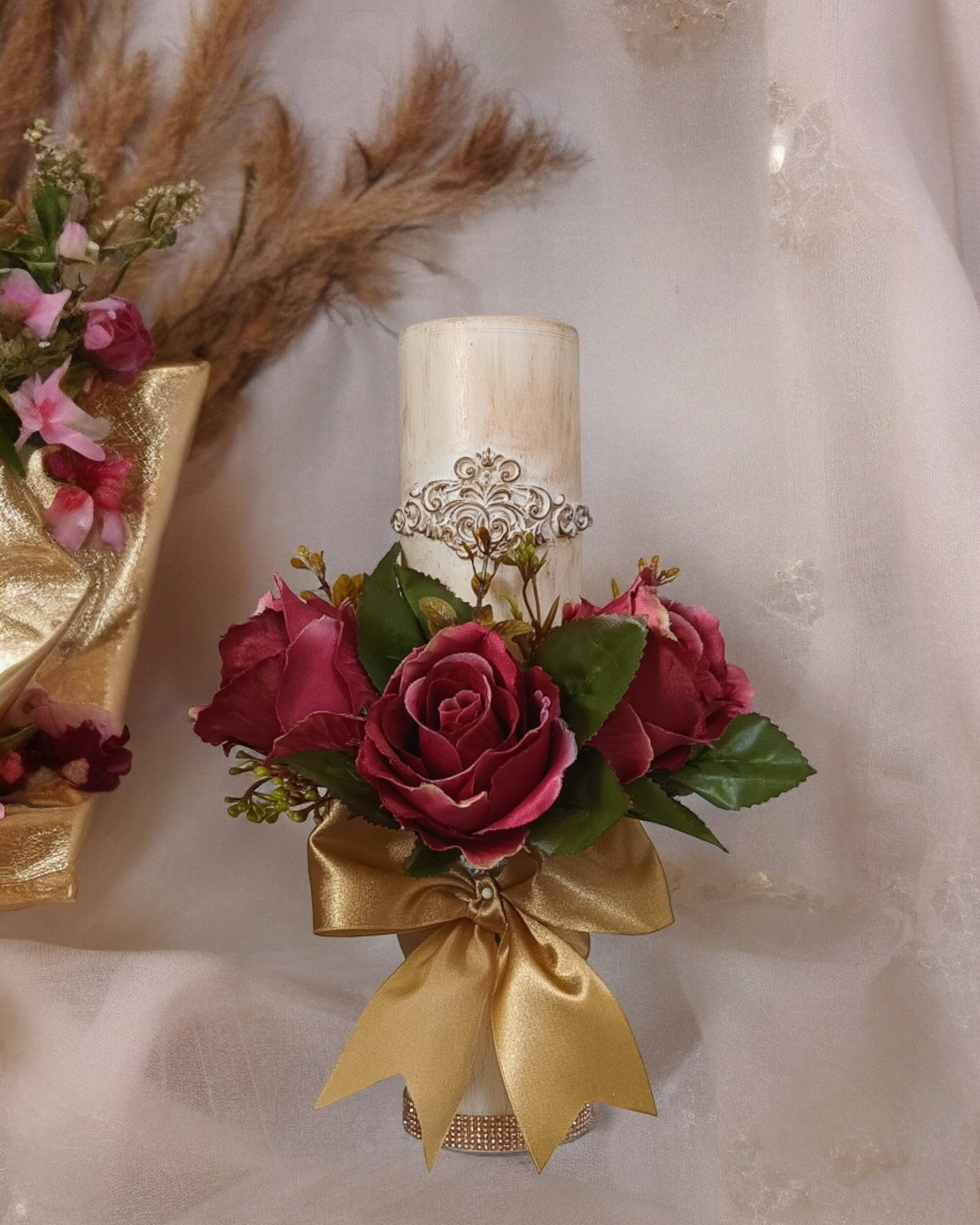 - Accesorizată cu trandafiri de culoare bordo și o panglică aurie decorată cu strass-uri rose gold, aceasta adaugă o notă de rafinament și lux.