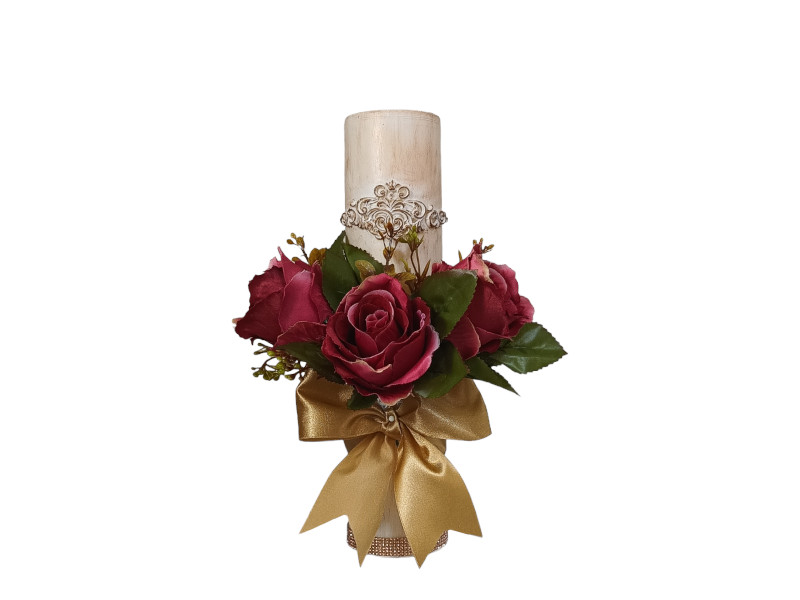 - Decorațiuni: Model 3D cu patină aurie aplicată manual, trandafiri din material de culoare bordo, panglică aurie cu strass rose gold