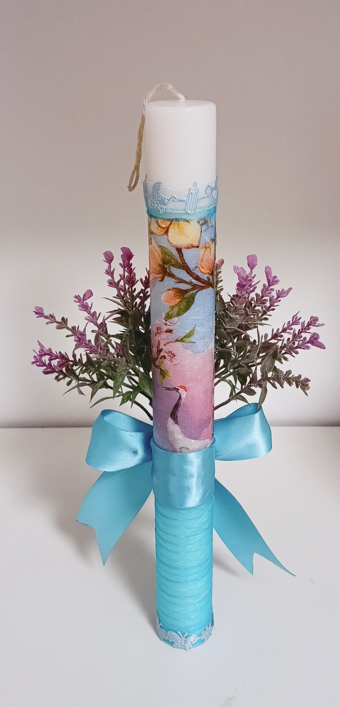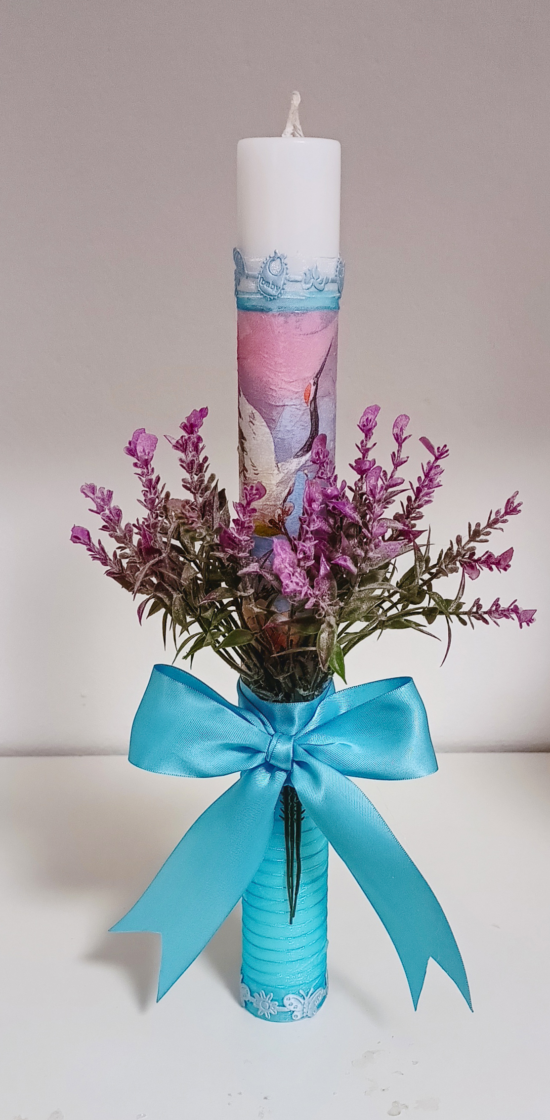 In peisajul măreț al acestei lumanări, stă cu grație și noblețe o barză, simbol al inceputului și al speranței, aducand cu sine promisiunea unui viitor luminos și prosper pentru micul vostru miracol.