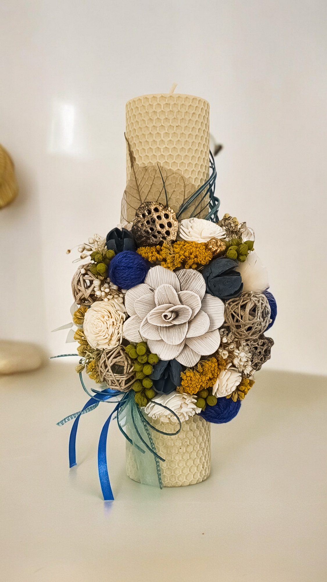 - Material: Ceară naturală de albine, alb-crem